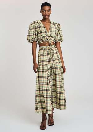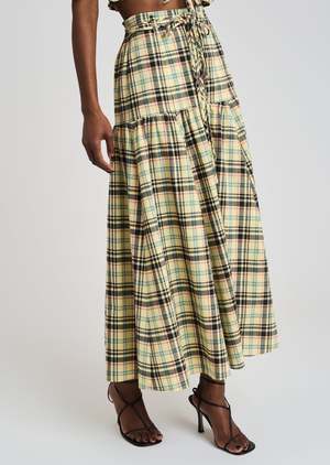 Description The Milly Belted Skirt in Yellow Multi by Derek Lam is a high rise, midi skirt fitted through the hip with tiered shirring. This a-line skirt has a waistband stacked with a two self-tie belts. Pair with the Bella Ruched Crop Top for a coordinated set. - Runs true to size - 60% Cotton, 40% Polyester