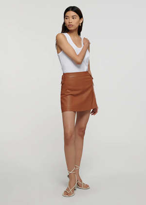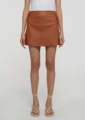 The Gina Lace Up Skirt in Luggage by Derek Lam 10 Crosby is an A-line mini skirt featuring lacing details at the side and tonal double needle topstitching, crafted in an ultra soft leather. - 100% Lamb Leather - Lining: 100% Polyester - Dry Clean Only - Fully lined.
