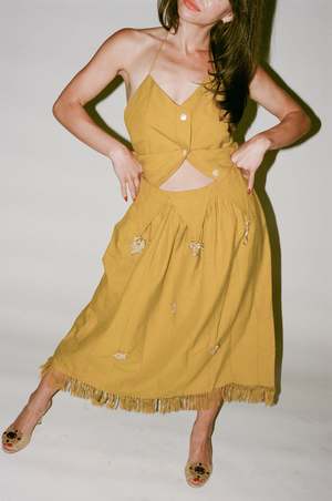 100% SILK Jester Skirt in Fool's Gold - FULL LENGTH SKIRT WITH A SIDE BUTTON CLOSURE. THIS SKIRT IS MADE FROM OUR BEAUTIFUL HAND WOVEN STRIP CLOTH, MADE ESPECIALLY FOR THE 100% SILK LABEL, WEIGHTED WITHOUT FEELING HOT AND HEAVY. TRIANGLE PANELS AT THE WAIST ARE ADORNED WITH HAND CAST BRASS AMULETS. GATHERED FOR A FULL SHAPE, AND TIED COTTON FRINGE AT THE HEM. AN ELEGANT, DURABLE PIECE THAT WALKS THE LINE BETWEEN PAST AND FUTURE. - THE AMULET COLLECTION IS A COLLABORATION BETWEEN 100% SILK AND JEWELLER DANIEL MAWULI QUIST. LOST-WAX BRASS CASTING WAS DEVELOPED BY THE ASANTE PEOPLE IN GHANA TO MAKE OBJECTS FOR GOLD TRANSACTIONS, SUCH AS WEIGHTS AND CANISTERS. LIKE THEIR FOREFATHERS, GHANAS BRASS CASTERS BEGIN THE PROCESS OF MAKING METAL ARTICLES BY SCULPTING IN BEESWAX. THE WAX FORM IS PAINTED WITH A PASTE OF FINE CHARCOAL AND WATER AND COVERED IN A MOLD OF COARSE PALM FIBERS AND CLAY. FINALLY, THE WAX IS POURED OUT AND REPLACED BY MOLTEN BRASS. THE FINISHED BRASS PIECE IS POLISHED WITH PALM NUT FIBERS AND SAND OVER SEVERAL DAYS. - SIZE EXTRA SMALL: WAIST 26, HIP 60, LENGTH 30 - SIZE SMALL: WAIST 28, HIP 62, LENGTH 30.5 - SIZE MEDIUM: WAIST 30, HIP 64, LENGTH 31 - Ariel is wearing size XS