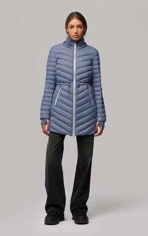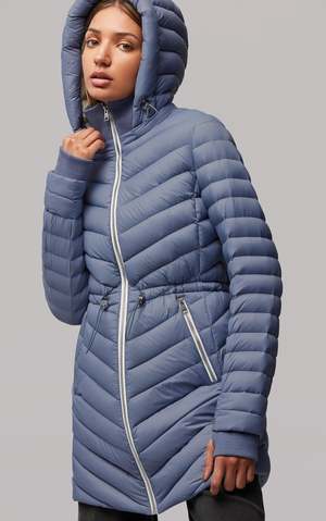 The JANAE by SOIA & KYO is a sustainable semi-fitted above-knee length lightweight puffer coat designed with RDS certified down and a 100% recycled nylon water-repellent shell. It features a rib collar and cuffs with a detachable hood and adjustable elastic drawcord waist tunnel for a figure-flattering silhouette. An outerwear staple to keep you warm as we transition into cooler winter weather. - Color:Steel-powder - Shell: 100% recycled nylon. Lining: 100% recycled nylon. Filling: 90% down, 10% feathers. - Semi-fitted - Above-knee length - Detachable hood with adjustable elastic drawcord & metal cord stoppers - 1x1 rib collar & storm cuffs - Waist tunnel with elastic drawcord & metal cord stoppers - SAB 2-way METALUXE zipper front closure - Up to -5 C / 23 F - RDS certified - Fill power of 700+ - 100% recycled shell fabric - Water-repellent - Down proof - Machine wash cold water. Use mild detergent. Wash inside out. Do not bleach tumble. Dry low heat with tennis balls until fully dried. Do not soak. Do not wring. Do not iron or press. Suggest to use special detergent and reproofing spray to optimise water repellent performance.