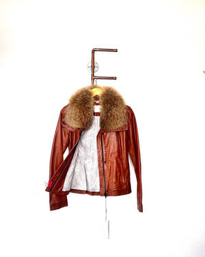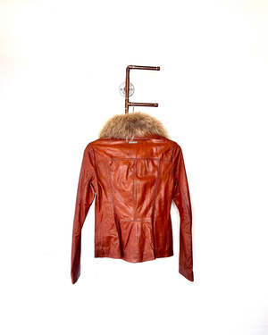 The Beatrix Leather Jacket by SOIA & KYO features a pouf fur neckline with a contrast of light fur and rich warm brown leather. Size XS. Lambskin leather outer with polyester lining. PTP: 16.5" STS: 15.5" Sleeve: 31" Length: 22"