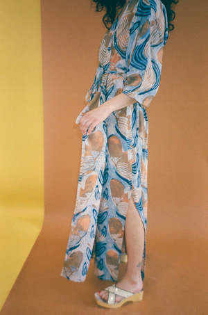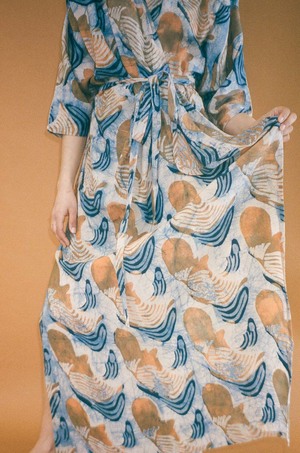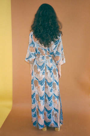 Long narrow wrap dress with mid length batwing sleeves and a deep v neckline. The Letsa Dress has soft pleats and a small cascade detail at the front waist, complimented by thick string ties that wrap around for closure. Features a side opening and slits on both ends for ease of wear without affecting the overall airy and dramatic look. Hand dyed for maximum theatricality in blue and orange hand batiked prints throughout. Measurements (laying flat, wrapped at natural waist): Size Small: Open bust, Waist 28, Hip 42, Length 52.5, Open shoulder, Sleeve (from neckline down) 21 Size Medium: Open bust, Waist 29, Hip 43, Length 52.5, Open shoulder, Sleeve (from neckline down) 21 Size Large: Open bust, Waist 30, Hip 44, Length 53, Open shoulder, Sleeve (from neckline down) 21.5 Material: 100% rayon. Hand wash in cold water. Hang to dry. Made in Ghana.
