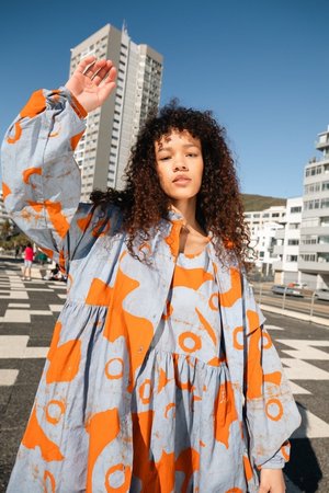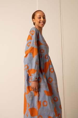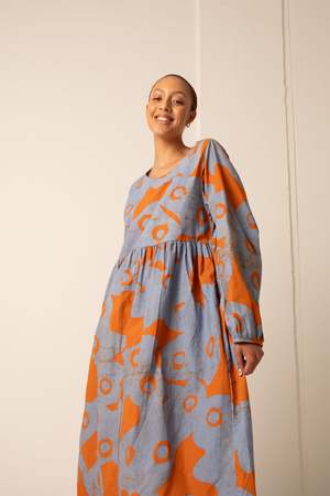 With a loose babydoll silhouette in light crisp cotton, the Mariam is a true slip on and go dress. The Mariam dress has a scoop neck, waist gathers, deep inseam pockets and long lantern sleeves that gather into a half inch cuff. This style is running large, feel free to size down. Leah is 5'9.5" and wearing size S (pictured indoors) Chen is 5'7.5" and wearing size S (pictured outdoors) Osei-Duro garments are hand dyed and each piece is unique. Please note that print placement and hue may vary.