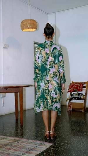 The Para Dress in Waters is a loose-fitting, airy dress crafted from 100% LENZING ECOVERO rayon. Featuring a mandarin collar, button-front closure, and batwing sleeves, it drapes softly while maintaining enough volume to create bold, sculptural shapes in motion. Inseam pockets and a slightly curved hem complete the relaxed, functional design. Details: Fabrication: 100% LENZING ECOVERO rayon Fit: True to size, loose silhouette Features: Mandarin collar, button-front, batwing sleeves, inseam pockets, curved hem Made in Ghana, hand dyed and batiked Unique: Each piece is hand-dyed; print placement and hue may vary Design: Waters A timeless, artisanal dress that combines effortless comfort, movement, and West African craftsmanship. Care guide: Hand or machine wash delicate, hang dry, or dry clean.