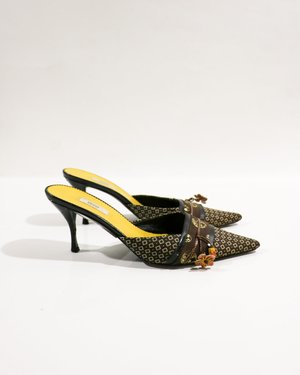 Embroidered mules from Prada. Features a pointed toe, floral tassel strap, and covered heel. Heel Height: 3" Material: Leather Rating: 6/10 - AS IS. Visible signs of wear. The insole is popping up. Scuffs at toe areas. Nicks and peeling on heels.