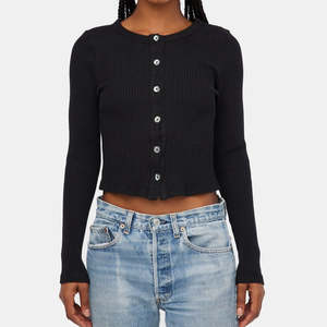 A 90s inspired fitting cardigan with contrast buttons and slightly cropped fit. Material - 92% Cotton 8% Spandex. Machine wash, gentle, cold, tumble dry low. Made in downtown Los Angeles by Lacausa.