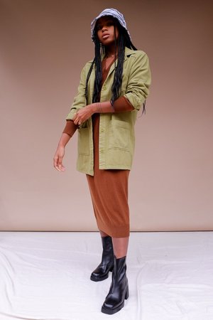 Lacausa Fletcher Jacket in olive green has a boxy, oversized fit chore coat with full sleeves that taper to a button closure at the cuff and big patch pockets with western style lines. In a soft, medium weight cotton twill. Model is wearing XS. Flat measurements taken from size S. Length: 36 1/4". LA11561 PIPE AND ROW