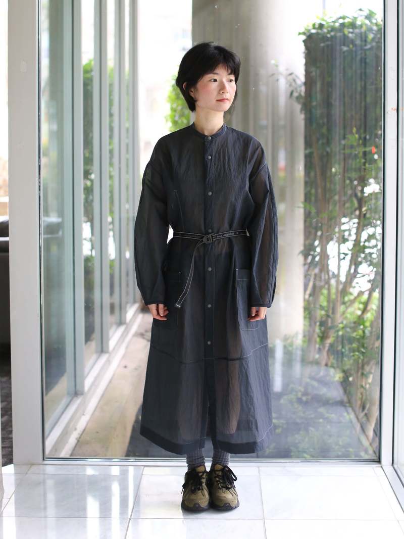 The and wander Sheer Ripstop Dress/Jacket combines lightweight nylon construction with quick-dry performance, making it ideal for active adventures. The sheer ripstop fabric offers breathability and durability, while the nylon fabric helps moisture dry quickly, making it suitable for layering or wearing on its own in warm weather. The fabric is sheer, so it is slightly see-through. Layering pieces are recommended underneath. This dress also doubles as a light jacket thanks to its button-down design. The belt is not removable, but it can be tied at the back. 100% nylon. Made in China. Model is 160 cm and wears size Small. Size measurements: Women's S: armpit to armpit 55, length 119, dropped shoulder width 52, sleeve length 51, hem circumference 167. Women's M: armpit to armpit 57, length 121, dropped shoulder width 54, sleeve length 53, hem circumference 169. Type: Dress