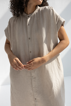 Button down, short sleeve dress with side seam pockets. - Model is 5'8 and wears OS - 100% Linen Made in Vietnam