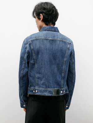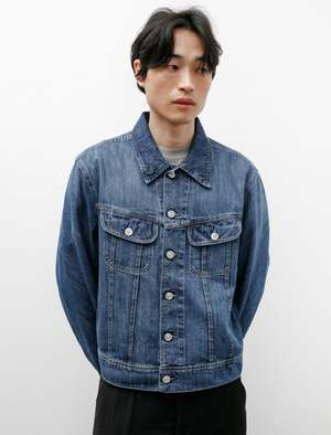 A classic, relaxed fitting midweight denim jacket with a medium stone-wash treatment. Features a classic collar, sturdy tack buttons at the closure, flap-closure front pockets, and tabbed side waist cinches. Uniquely styled, bias-cut, two piece sleeves drape gently from the shoulder to guide the eye through the classic silhouette while simultaneously creating a subtle graphic contrast through the shifted grain. Constructed using chain stitched flat felled seams through high stress points for improved durability; logo2 embossed hardware throughout, logo2 patch at the rear waist. - Made in Portugal - 100% cotton - Relaxed fit, cropped - Machine wash - KIM IS 6'1, 155LBS AND WEARS SIZE 48