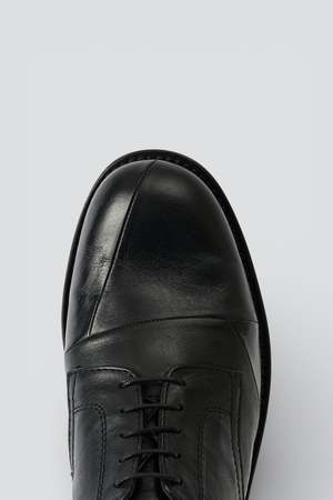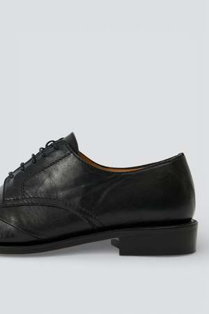 Malleable Black Patched Parade from Our Legacy. Produced in Italian bull leather, this derby style reworks the Uniform Parade with asymmetric cutlines and patched leather panels in contrasting shine. The shoe is Norwegian welted and finished with a leather outsole, a stacked heel and a smooth leather lining. - Italian bull leather / leather lined