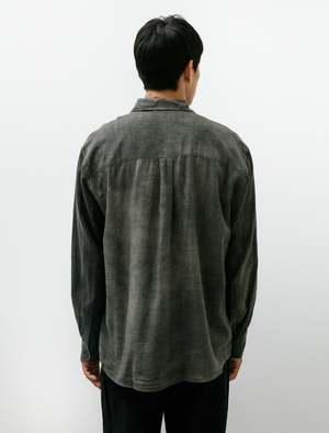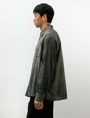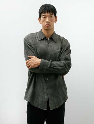 A relaxed fitting, button-front shirt cut from an airy cotton/wool gauze shirting in a faded grey-green evocative of winter clouds. Features a classic collar, a left breast pocket, a clean finished rear yoke with a central box pleat and a curved hem. Considered volume throughout highlights the weightless drape of the cloth creating a soft-shouldered silhouette with a sense of casual elegance. Constructed using chain stitched, flat felled seams throughout for a long lasting, encased finish; matte finished brown Mother of Pearl buttons.