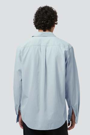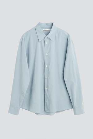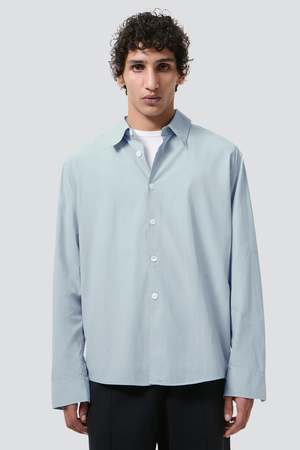The Powder Blue Liquid Poplin Beyond Shirt from Our Legacy is produced in a Chinese poplin fabric woven from a blend of lyocell and cotton. The Beyond Shirt has a regular, straight fit and features mother of pearl buttons, a curved hem, and a fine, tightly woven structure that gives the fabric a crisp hand with a subtle sheen. - 60% Lyocell, 40% Cotton - Type: Shirt
