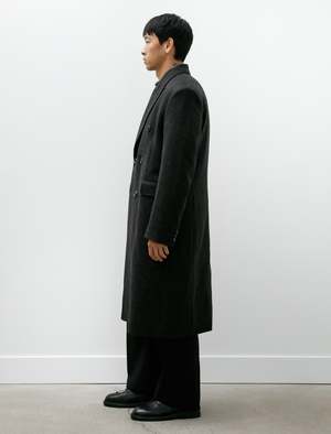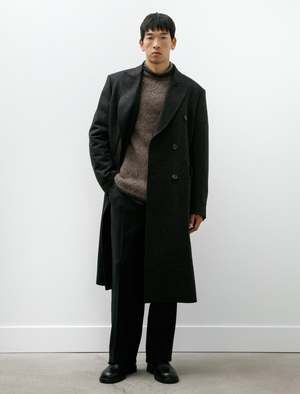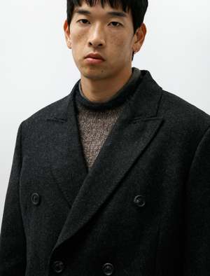 A formal-cut, double-breasted, tailored top coat cut from an Italian, water repellent wool/nylon melton in a deep charcoal melange. Features a formal collar with a wide, curved peak lapel, flap-closure welted waist pockets, functional surgeon's cuffs, and an extended rear vent pleat. Lightly padded shoulders offer a strong stance to the silhouette while traditional tailoring lines offer an elegant, sophisticated fit that contours the body with a gentle hand. Constructed with a full lining in black cotton/viscose satin including two inner breast pockets for a fully encased finish; cattle horn buttons throughout.