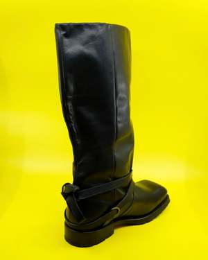 Black cattle hide leather engine boot featuring a lug Vibram sole. Features a wrapped harness at the lower shaft and a squared toe.