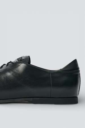 The Sombre Satine Bovine Sneak In from Our Legacy is a relaxed formal shoe hybrid produced in Italian cow leather with a soft, silky feel and a semi-shine. The shoe features a Vibram sole, topstitching detail at the heel, and an inverted woven Our Legacy logo2 label. - Italian cow leather