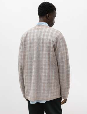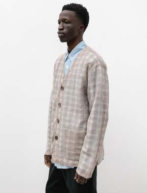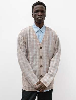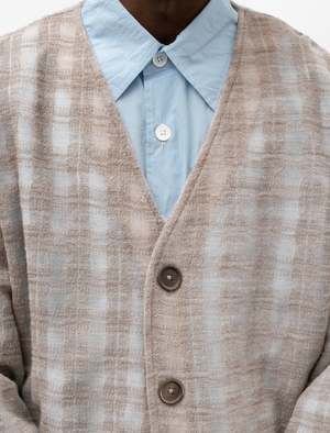 A relaxed fitting four button cardigan cut from a super lightweight, gauzy checked wool in mixed grey and beige. Features a classic cardigan neckline, and patch pockets at the waist. The translucent finish of the fabric makes this cardigan a perfect layering piece with easy visibility of under layers. Finished with a unique, matte finished, oversized Mother of Pearl buttons. - Made in Portugal - 67% wool, 33% nylon - Relaxed fit - Hand wash - JAMES IS 6'1", 145LBS AND WEARS SIZE 48