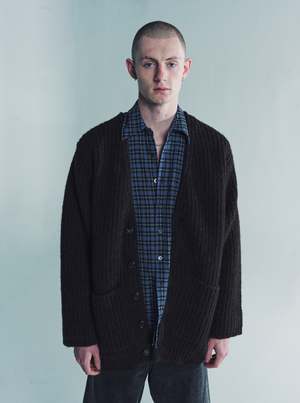 Our Colossal Cardigan in Welsh Black Albion Wool. Produced in an English heritage wool yarn, the mens ribbed knit Colossal Cardigan has a long, oversized fit and features a v-neck collar, two front patch pockets and horn buttons. This garment is manufactured using a carefully sourced yarn. The natural characteristics of the yarn, combined with the construction of the knit allows the garment to expand when worn. The garment shall be shaped by its wearer and naturally distress over time to finish the design process. To help keep the integrity of the garment please store the garment folded. Wool Model wears Size