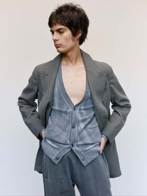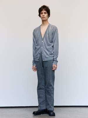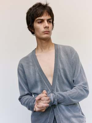 The Parallel Cardigan by Our Legacy is produced in refined Italian merino wool. This men's cardigan features a relaxed fit with dropped shoulders, a soft texture enhanced by a custom cold spray dye treatment, a V-neck collar, pearl buttons, full needle placket, and two front pockets. Topstitched hems with rolling edges create a raw, slouchy aesthetic.