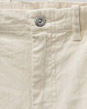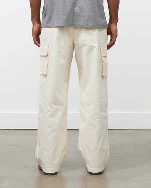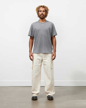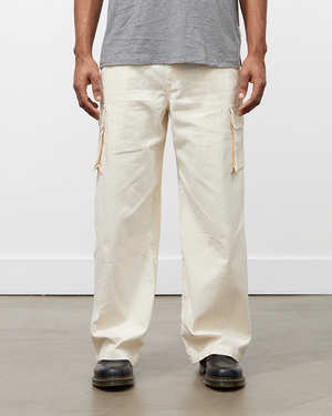 ello sailor! Same old Mount Cargo that from afar looks like an ecru, painter pant sort of vibe, but it has a navy stripe on the reverse side that gives it some subtle detailing and elevation. Italian striped fabric Cargo side pockets Darted knees YKK zip fly Steel buttons Brass snaps Single back pocket Relaxed, straight cut Made in Portugal 100% Cotton Model is 187cm and is wearing a size 48 More from Our Legacy.