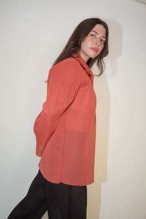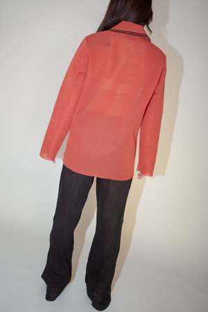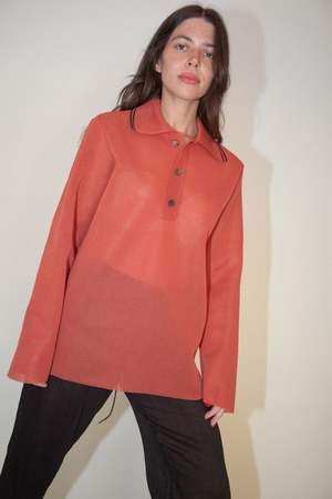 Our Legacy Big Piquet Top in Crimson Red - Produced in an Italian polyester yarn, with a dry handle, the super fine gauge knit Big Piquet has a relaxed, oversized fit features a striped collar, ribbed detailing and mother of pearl buttons. - This garment is manufactured using a delicate material with a naturally loose construction. Please handle with care and wash according to washing instructions. Be especially careful with jewelry and other pointed objects that might harm the surface. - The Big Piquet is oversized with a relaxed fit. If you wish a less exaggerated fit we suggest to go down one size. - Fabric: 100% polyester - Ariel is wearing size 34