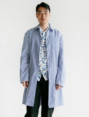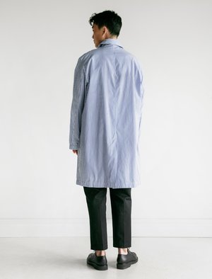This lightweight Mac is cut from highly dense shirting fabric, made with a relaxed fit almost like a lab coat. The coat is unlined, minimal in nature with covered button placket, simple stretch cuffs, and single rear vent. Jetted pockets at the hip. - Made in Portugal - 100% cotton - Relaxed fit - Machine wash - Kim is 5'11", 155 lbs and wears size 46/small