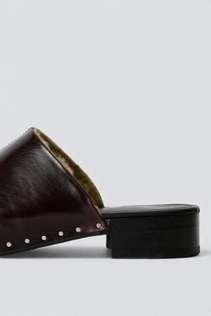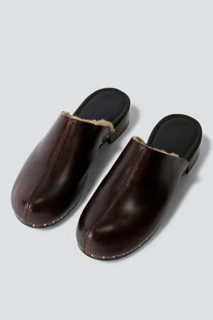 The Deep Americano Leather Naoto Clog from Our Legacy is produced in hand-cut Italian grain leather with a textured surface and raw edges. This slip-on clog features a stapled upper construction, rounded toe, centre seam, wool fur lining, and a Vibram sole. - 100% Italian grain leather / wool Size US UK CM WIDTH 35 2 1 23.1 7.7 36 3 2 23.8 7.9 37 4 3 24.4 8 38 5 4 25.1 8.1 39 6 5 25.8 8.4 40 7 6 26.5 8.6 41 8 7 27.1 8.7 42 9 8 27.8 8.8 43 10 9 28.4 9 44 11 10 29.1 9.1 45 12 11 29.8 9.2 46 13 12 30.4 9.4