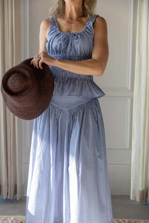 The Gigi Top by Ciao Lucia features a gathered bust and smocked waist with a slight peplum hem. Color: Blue Stripe Fabrication: Cotton Fit Notes: True to size Type: Day Top