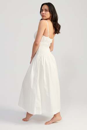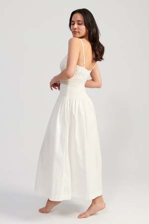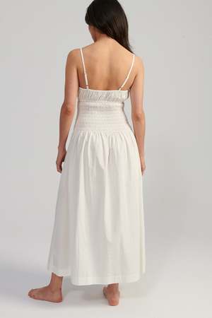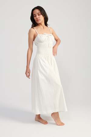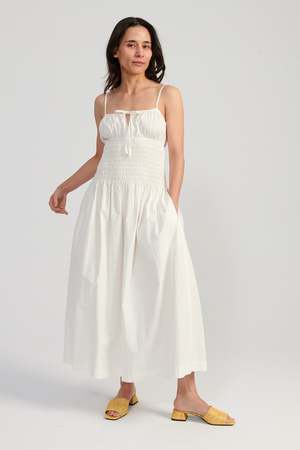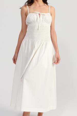 The Barbara Dress is a spaghetti strap midi dress featuring a keyhole tie at the bust and a smocked bodice. Straps are adjustable.