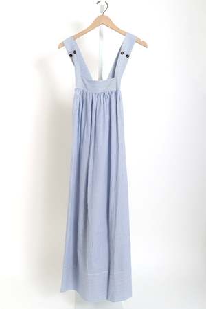 Sleeveless cotton midi dress in white and blue stripe with a cross-back detail and apron-style placket. The ultimate day-to-night dress for morning brunches, afternoon strolls, and golden hour dinner reservations. True to size. Model wears size small.