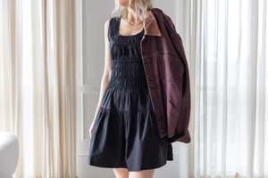 The Kala Dress by Ciao Lucia features a scoop neckline and smocked bodice with tiered skirting. Color: Black Fabrication: Cotton Fit Notes: True to size