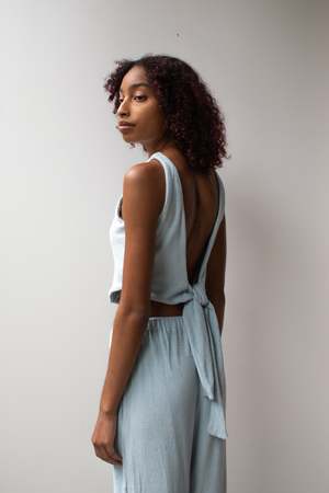 Terrycloth crop top with back tie closure. Lined. Details 100% Cotton OEKO-TEX STANDARD 100 Hand wash cold Made in Indonesia Sizing Model is 5'8" (178cm) and wearing size S.