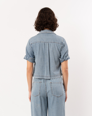 The Denim Cuffed Shirt by Lilla P. adds a chic twist to everyday denim. Designed in lightweight 100% cotton denim, this style has elbow-length sleeves with subtle shirring and fullness above the cuff for a feminine touch. Pearlized rim snap buttons lend a hint of western flair, while the slightly shorter body length makes it the perfect match for coordinating denim bottoms. Whether styled with matching separates or your favorite pieces, this is a fresh take on the classic denim shirt. Fabric: Cotton lightweight denim, 100% cotton. Care: Machine wash cold. Do not bleach. Tumble dry low. Cool iron if needed or dry clean. Style: PA3260-BWH.