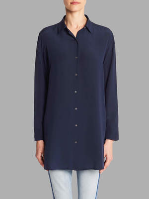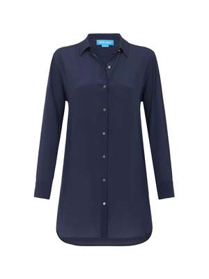 The M.I.H Jeans Oversized Shirt is a slouchy fit style with extra length in the body designed to dip to the mid thigh and below the bum. Constructed here an a lightweight navy blue silk this ultra comfortable piece features an exposed buttons down the centre front opening and at the cuffs. Tuck yours in to your favourite black slim leg pants for a super versatile day to day look. ---- FABRIC OR COMPOSITION 100% Silk SIZE AND FIT The M.I.H JEANS OVERSIZE SHIRT in NAVY is an oversized style Sleeve Length: 24.5in / 62.2cm Back Length: 34in / 86.4cm Measurements taken from Size S Model wears a Size S - Paulina is 178cm / 5'10"