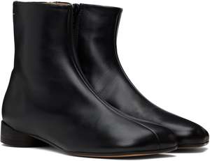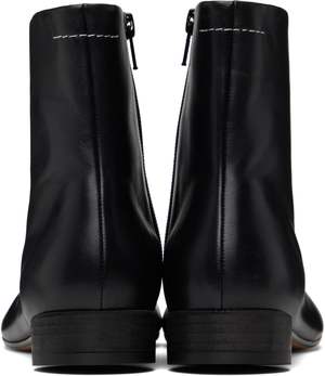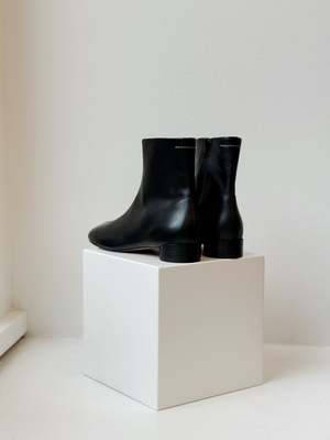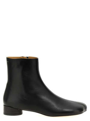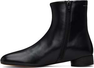 These black ankle boots by MM6 Maison Margiela feature a small heel and their signature anatomical toe shoe for a comfortable and stylish fit. Upper: 100% Ovine Leather | Lining: 100% Calf Leather | Inside: 100% Calf Leather | Sole: 100% Calf Leather Traditional European to U.S. sizing 37 | 6.5-7 38 | 7.5-8 39 | 8.5-9 40 | 9.5-10 41 | 10-10.5