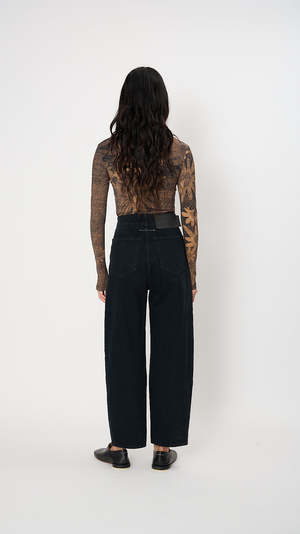MM6 Maison Margiela 5 Pocket Barrel Leg Pants in Black The 5 Pocket Wide Leg Jeans have a loose, exaggerated wide-leg silhouette made of heavy denim. They feature a button and zip closure, belt loops, slip hip pockets, and double back patch pockets. Materials: 100% Cotton Made in Italy