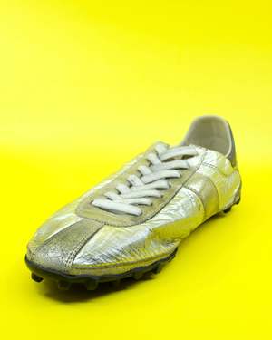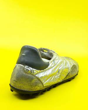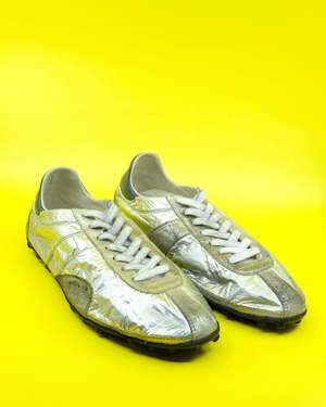 Crafted from drill, hairy suede and calfskin with a vintage treatment, the Sprinters silhouette is inspired by retro running shoes. Block colour contrast is met with the classic tongue displaying the numeric logo2. The studded base also features number detailing with the 22 encircled indicating the Maison's footwear collectsion. Maison Margiela's signature stitch appears at the back; the opposite of a label.