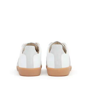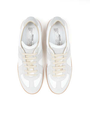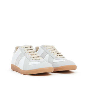 The Replica sneakers in nappa leather and suede feature the iconic single stitch at the back. Inspired by Austrian sports shoes from the seventies, Maison Margielas Replica sneakers are continually reworked in line with each season's inspirations. Heel height: 3 cm Lace-up sneakers in nappa leather and crust leather Contrasting sole Maison Margiela logo2 label on the tab White stitching at the back Internal Replica label Internal elastic Upper: 100% calf leather Contrast: 100% calf leather Lining: 100% cotton Sole: 100% rubber Made in Italy. Style No. S57WS0236 P1895 101 Style ID: S57WS0236P1895101