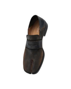 The Tabi City loafer is crafted in suede with a foil treatment, shaped with a collapsible heel that transforms it into a babouche silhouette. It features the Tabi split toe, inspired by the traditional 15th-century Japanese sock bearing the same name, launched for the Maison's debut collectsion in 1989. A heritage icon continually reinterpreted, it captures the avant-garde spirit of the Maison. Maison Margiela's signature single white stitch appears at the back. Suede with foil treatment Tabi split toe Four stitches at the back Upper: 100% calf leather Contrast: 100% calf leather Lining: 100% ovine leather Inside: 100% ovine leather Sole: 100% calf leather Contrast: 100% rubber Heel height: 2.1 cm to 2.8 cm Made in Italy Style No. S57WR0117 P7549 H8322 Type: Loafers