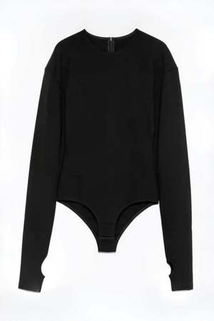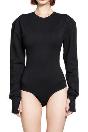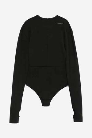 This thicker cotton jersey black bodysuit features a crewneck, a zipper on the back, and MM6's signature white stitch. The sleeves have thumbholes and are made to be extra long to create a slight bunching throughout the wrists and forearms. The shoulder seam is slightly exaggerated to create a slightly wider shoulder than a super tightly fitting bodysuit sleeve. Fabric: 75% viscose / 21% polyamide / 4% elastane.
