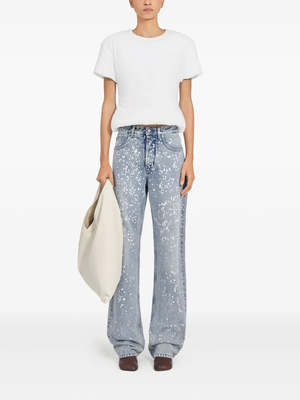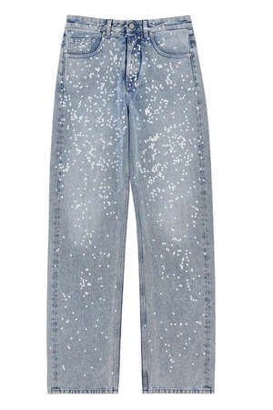 A light wash denim jean with a classic five-pocket construction and playful painted white dot detailing throughout, giving the illusion of sequins. Color: Blue Material: 100% Cotton Fit: Take your true size.