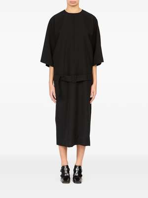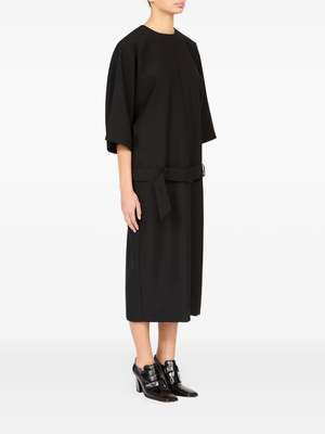 This dress hits about mid-calf and has a drop waist belt made of the same wool fabric. Great for the office. This dress is made of 100% virgin wool thin suit-like material. Details: 100% Virgin Wool Color: Black