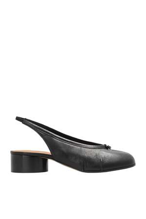 The Tabi New Ballerina Slingback by Maison Margiela embodies avant-garde elegance in a refined, modern interpretation. Crafted from smooth premium black leather, the design is defined by the iconic Tabi split-toe cut-out, a signature detail that references historical footwear while maintaining contemporary minimalism. A subtly exposed heel and delicate slingback strap create a sensual silhouette, while the wide cylindrical mid-heel ensures comfort and stability throughout wear. Finished with the Maison Margiela logo2 inside, this understated yet distinctive style reflects the house's mastery of sophisticated simplicity. Made in Italy.