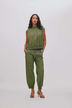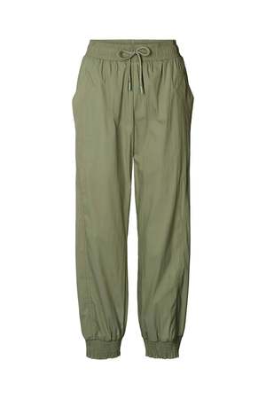 These trousers are made from a lightweight and airy material that feels comfortable to wear. They feature relaxed, loose-fitting legs with elastic cuffs, side pockets, and an elastic waistband with a drawstring. 81% cotton, 16% polyamide, 3% elastane.