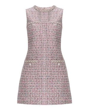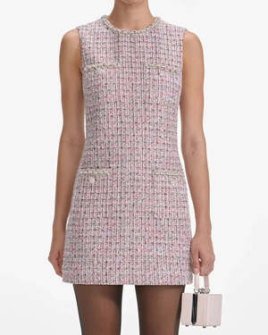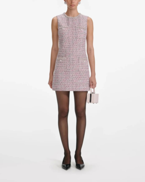 The Boucle Sleeveless Mini Dress by Self-Portrait is crafted from a wool blend boucle fabric in pink. This sleeveless mini dress features diamant trim accents on the neckline, pockets, and hemline, functional pockets, and a mod-inspired shift silhouette. Back zip closure. Minimal stretch. Material: 10% Wool, 85% Polyester, 5% Viscose Lining: 100% Polyester Model is 5ft10/178cm and wears a size US2 (UK6). Fit: True to size. Fitted style.
