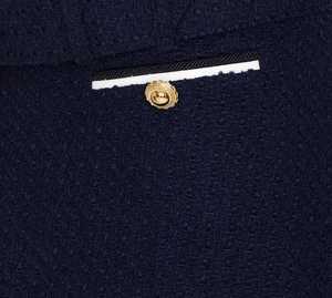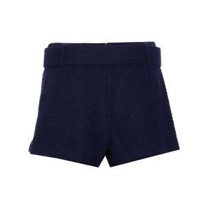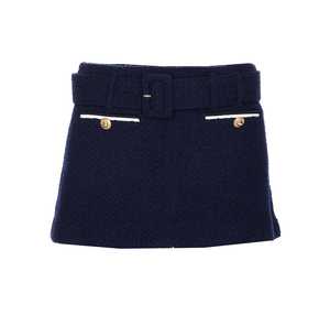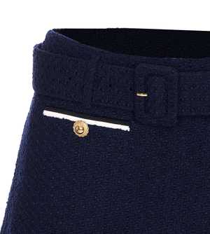 Self-Portrait blue boucl skort with zip and hook closure, belt at waist, and frontal golden jewel detail. Composition: 40% Polyester, 26% Acrylic, 24% Wool, 10% Polyamide.