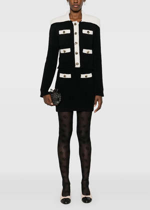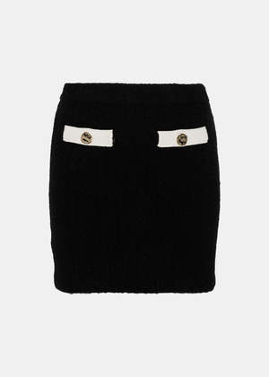 Alpaca blend knitted mini skirt in black. Knitted construction Gold-tone buttons High waist Elasticated waistband Two front patch pockets Straight hem Thigh-length Unlined 67% Alpaca Wool 29% Polyamide 4% Elastane Made in China.