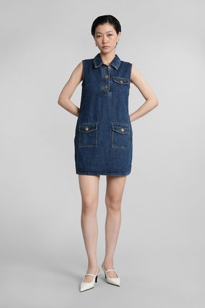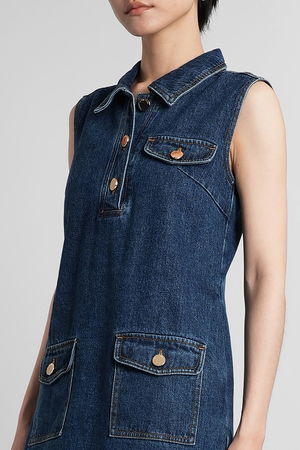 In blue cotton, collar, sleeveless, logo2 buttons, frontal pockets with flap. 100% cotton. Made in China. The model is 180 cm tall and wears a size 8.