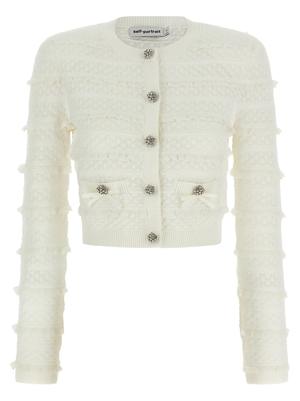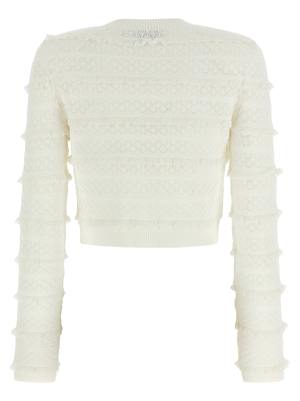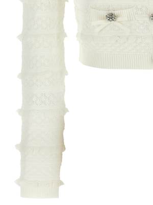 Women > Clothing > Sweaters "Pointelle Diamante" knit cardigan with openwork and lace ruffle inserts, crew neck, front closure with jewel buttons, pocket detail with buttons, and long sleeves with ribbed cuffs. Composition: 82% viscose, 18% polyester.