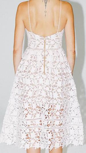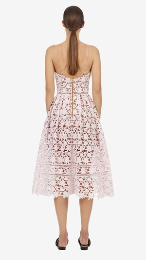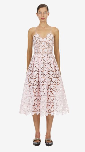 Self Portrait Azaelea Dress - Soft Pink The Azaelea Dress is crafted using textured lace and a contrasting, transparent ladder trim. The dress features delicate spaghetti straps and the front neckline is framed with a scallop edge. The skirt has a full, pleated silhouette and finishes on the scallop edge. The dress fastens neatly at the plunging back with an exposed zip. Material: main: 100% polyester lining: 91% polyester, 9% elastane trim 1&2: 100% polyester Dry clean only.